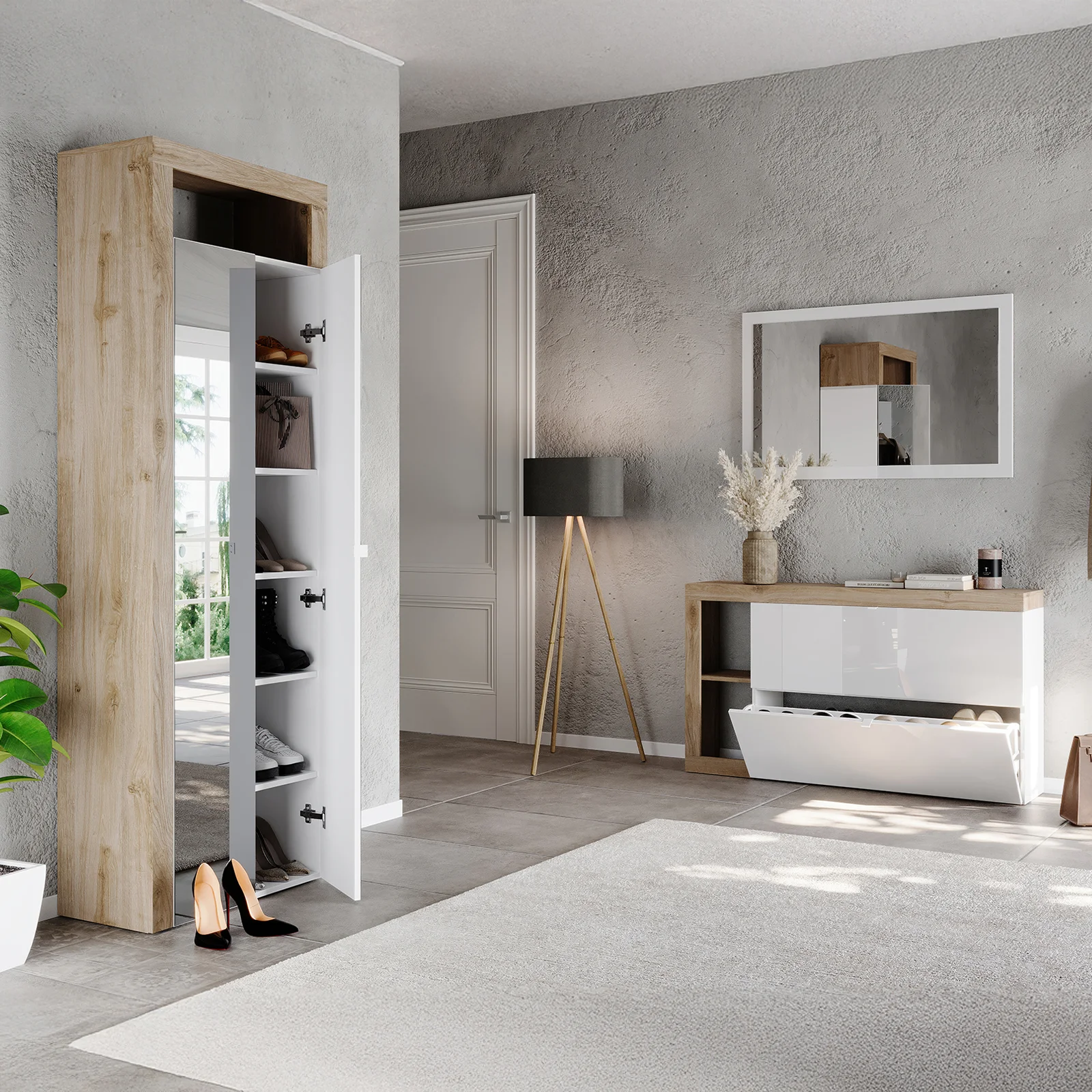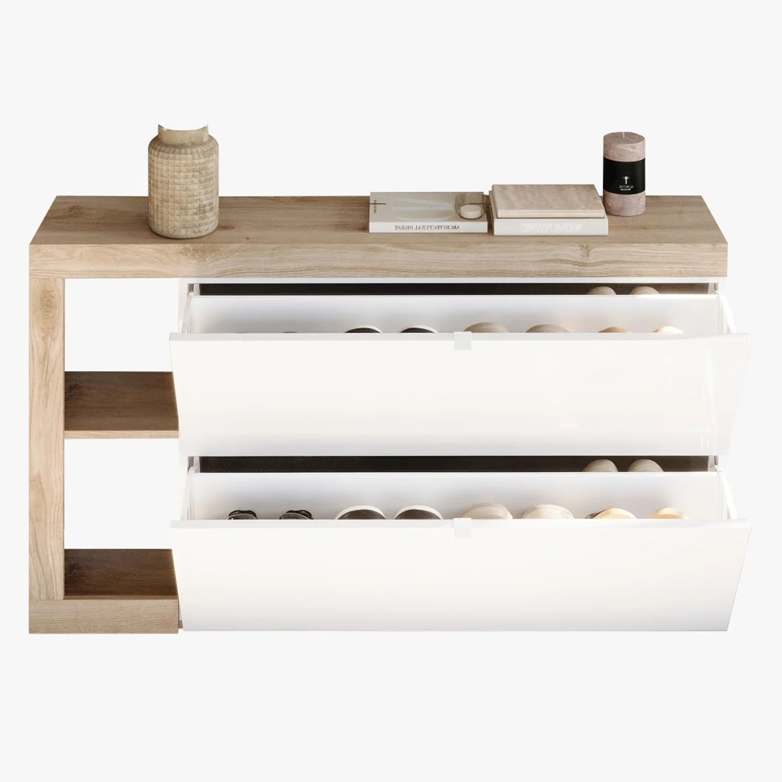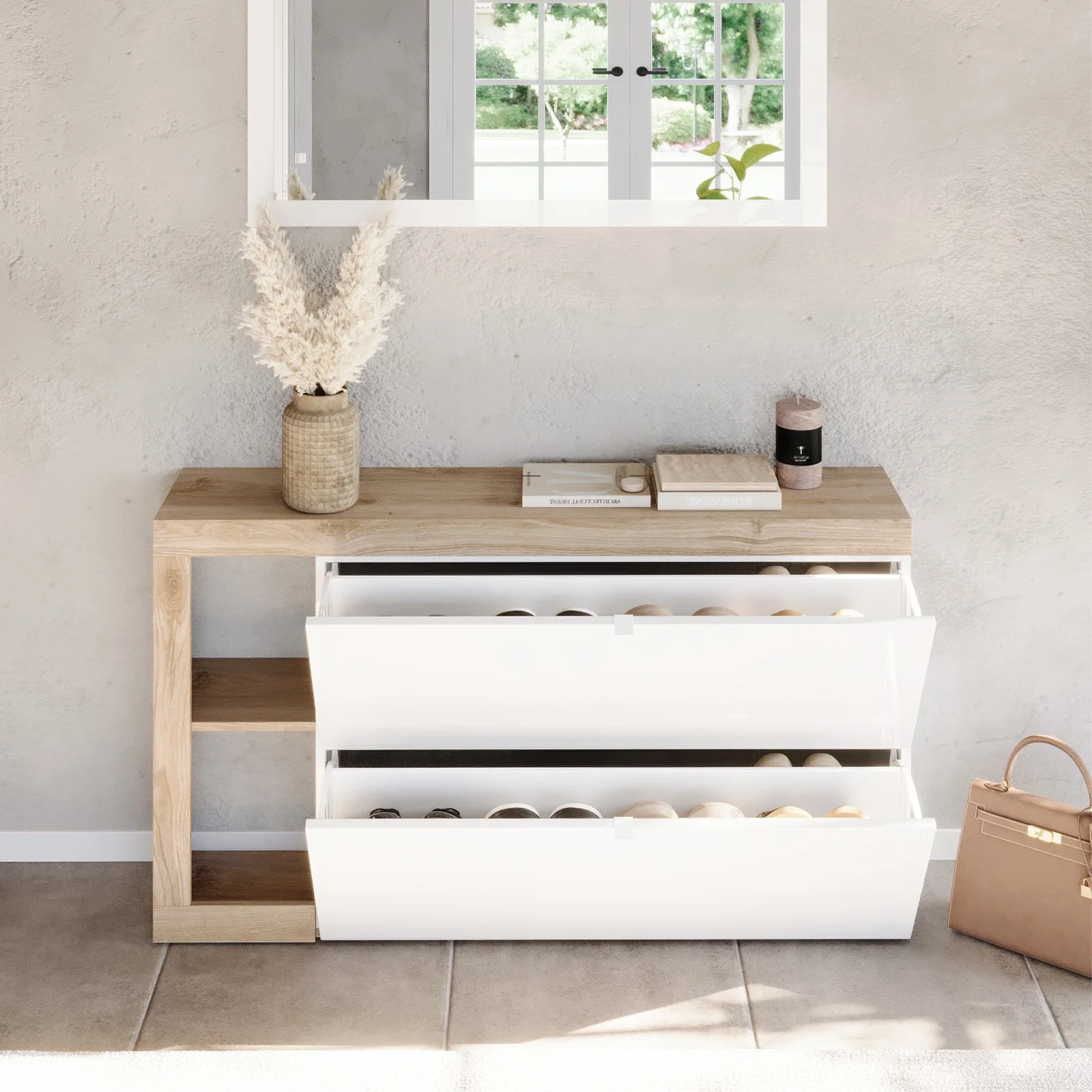 Scopri la scarpiera sospesa con ante a ribalta e porta nella tua casa eleganza e organizzazione in un solo gesto.