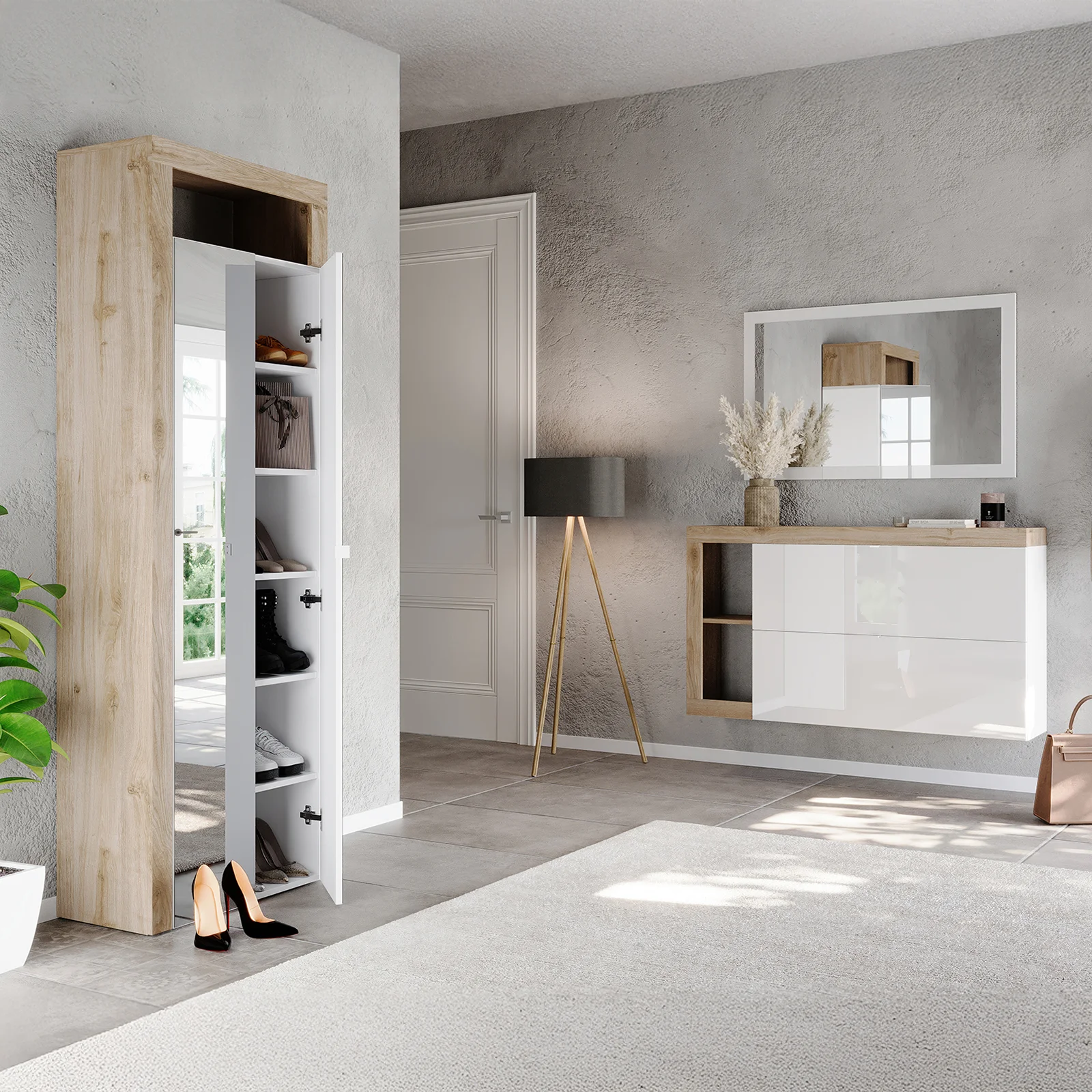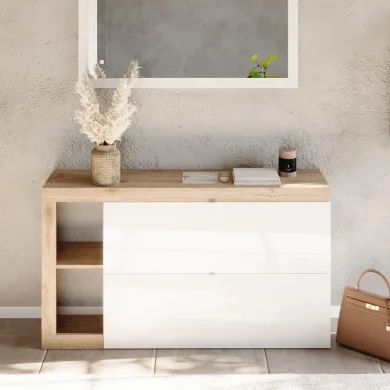 Compatta, funzionale e dal design pulito: la scarpiera sospesa con due ante a ribalta è la soluzione perfetta per chi desidera un ingresso ordinato e moderno, anche in spazi ridotti. Il sistema a ribalta salvaspazio consente di riporre ordinatamente più paia di scarpe, mantenendole sempre a portata di mano ma fuori dalla vista.