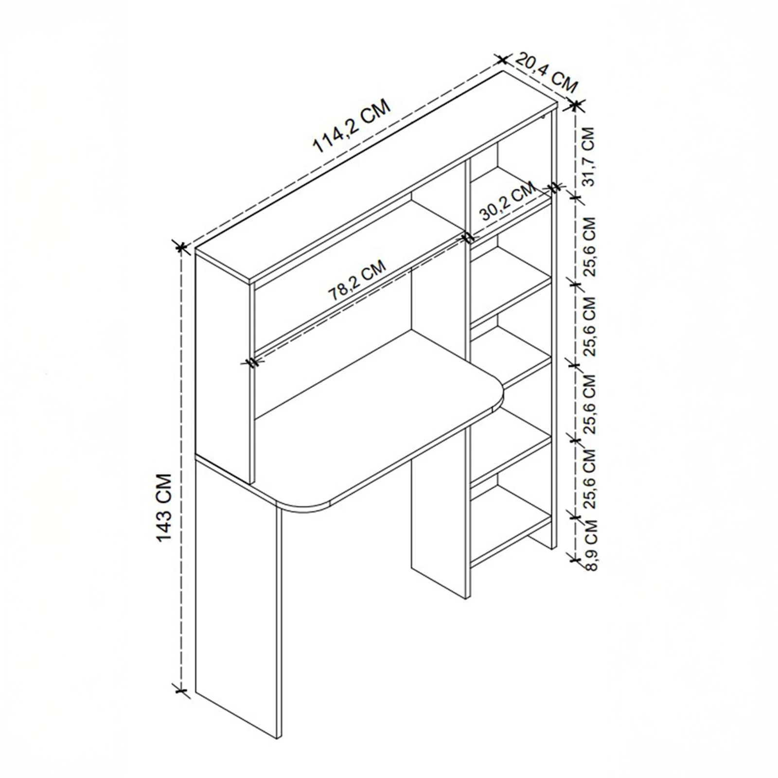 La struttura compatta dispone di 6 vani a giorno con 5 ripiani, ideali per organizzare libri, documenti e oggetti decorativi. Il piano scrivania, stabile e resistente, supporta fino a 20 kg, garantendo la solidità necessaria per lo studio, il lavoro o l’utilizzo del computer.