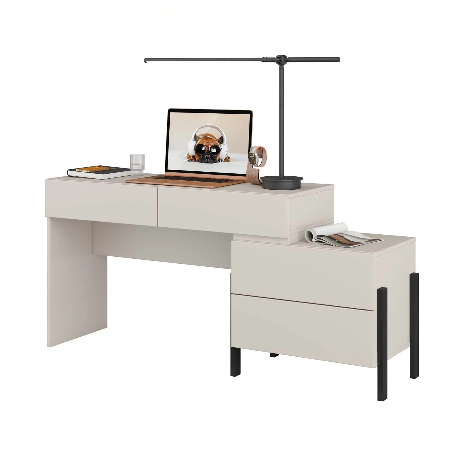 La finitura beige cashmere dona un tocco luminoso e raffinato, capace di valorizzare ambienti sia moderni che più classici. Le gambe in metallo nero opaco creano un piacevole contrasto cromatico, rendendo il design ancora più attuale e stabile.