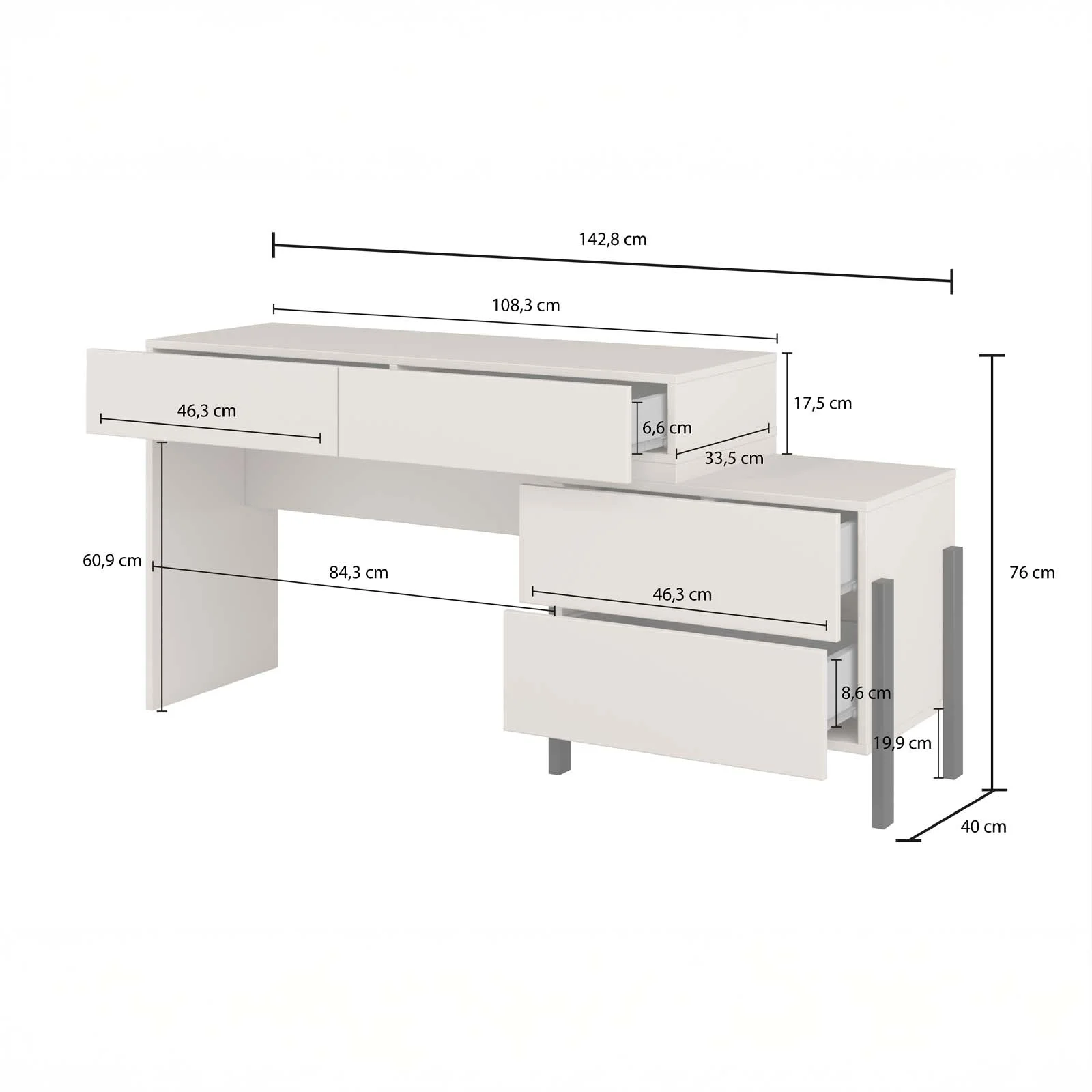 La struttura è composta da 3 cassetti: due compatti, ideali per accessori, cancelleria o piccoli oggetti, e un cassetto più grande con due vani interni, perfetto per documenti e tutto ciò che vuoi tenere sempre in ordine e a portata di mano.