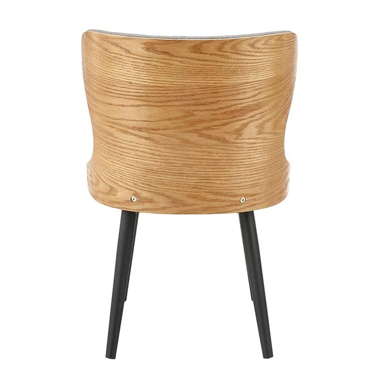 La seduta è realizzata in tessuto grigio ed è ricoperta da una lastra in finitura rovere nella parte posteriore, mentre la struttura è composta da quattro solide gambe in acciaio nero.
