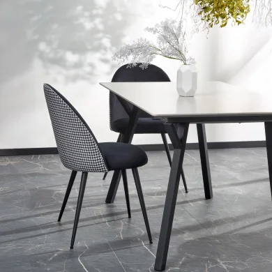 Una presenza elegante e moderna che non passa inosservata: la Sedia Aleron si distingue per il suo equilibrio tra design contemporaneo e comfort avvolgente. La seduta imbottita in velluto, con finiture bianche e nere, regala una sensazione morbida e piacevole al tatto, aggiungendo un tocco di stile raffinato a ogni ambiente.