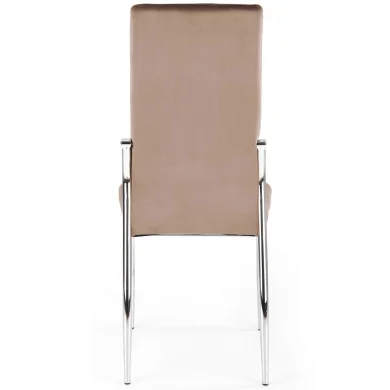 La sua seduta imbottita color beige, impreziosita da cuciture quadrate rifinite con cura, offre un comfort avvolgente, mentre le gambe in acciaio cromato aggiungono un tocco di modernità e leggerezza visiva.