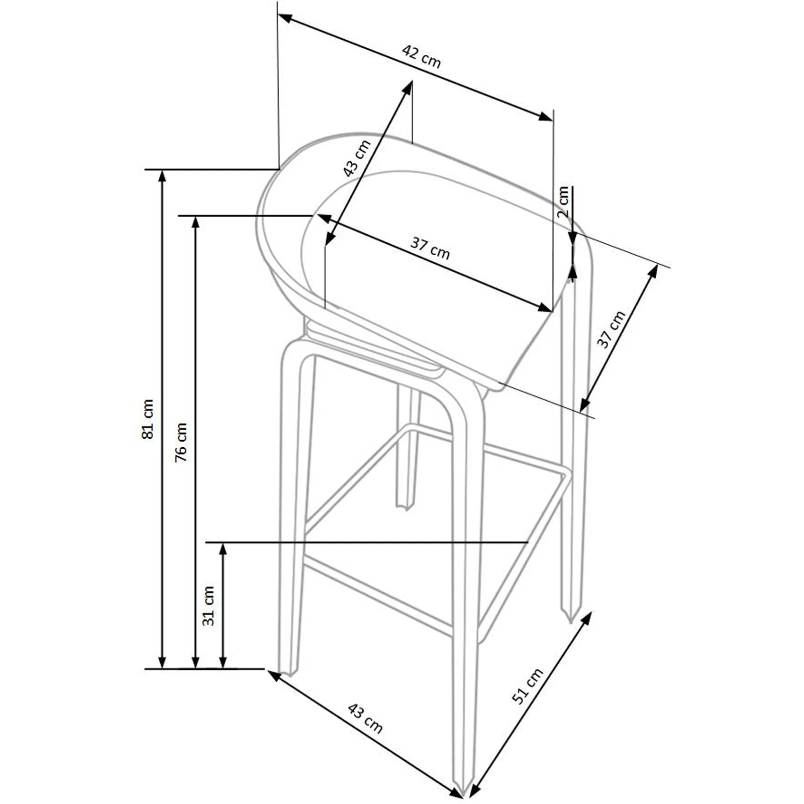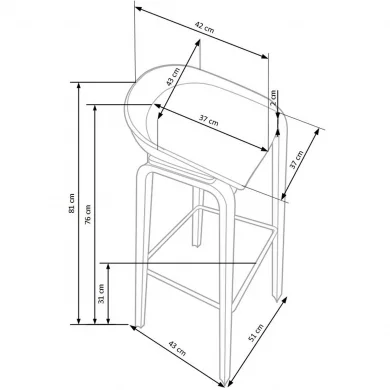 La struttura è completata da quattro gambe snelle e stabili, abbinate a un poggiapiedi che assicura sostegno e praticità nella seduta. Il contrasto tra materiali tecnici e tessili dona personalità allo sgabello, rendendolo perfetto per ambienti moderni, cucine con isola o zone snack informali.