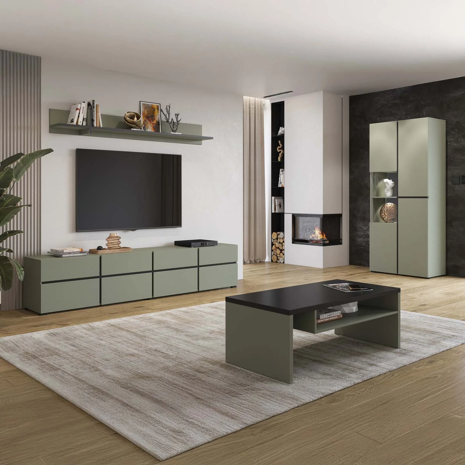 La finitura verde opaco, in contrasto con i dettagli interni neri che caratterizzano la linea, regala freschezza e modernità, creando un ambiente elegante e ricercato.