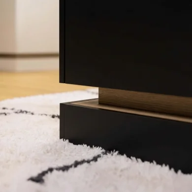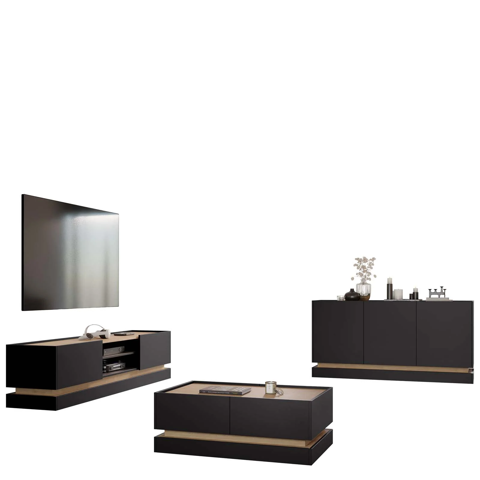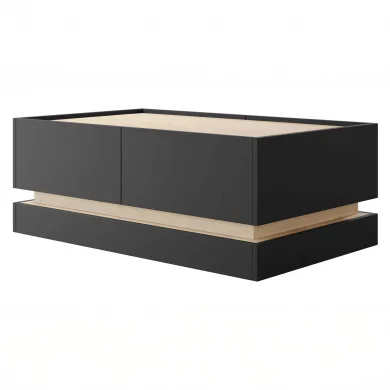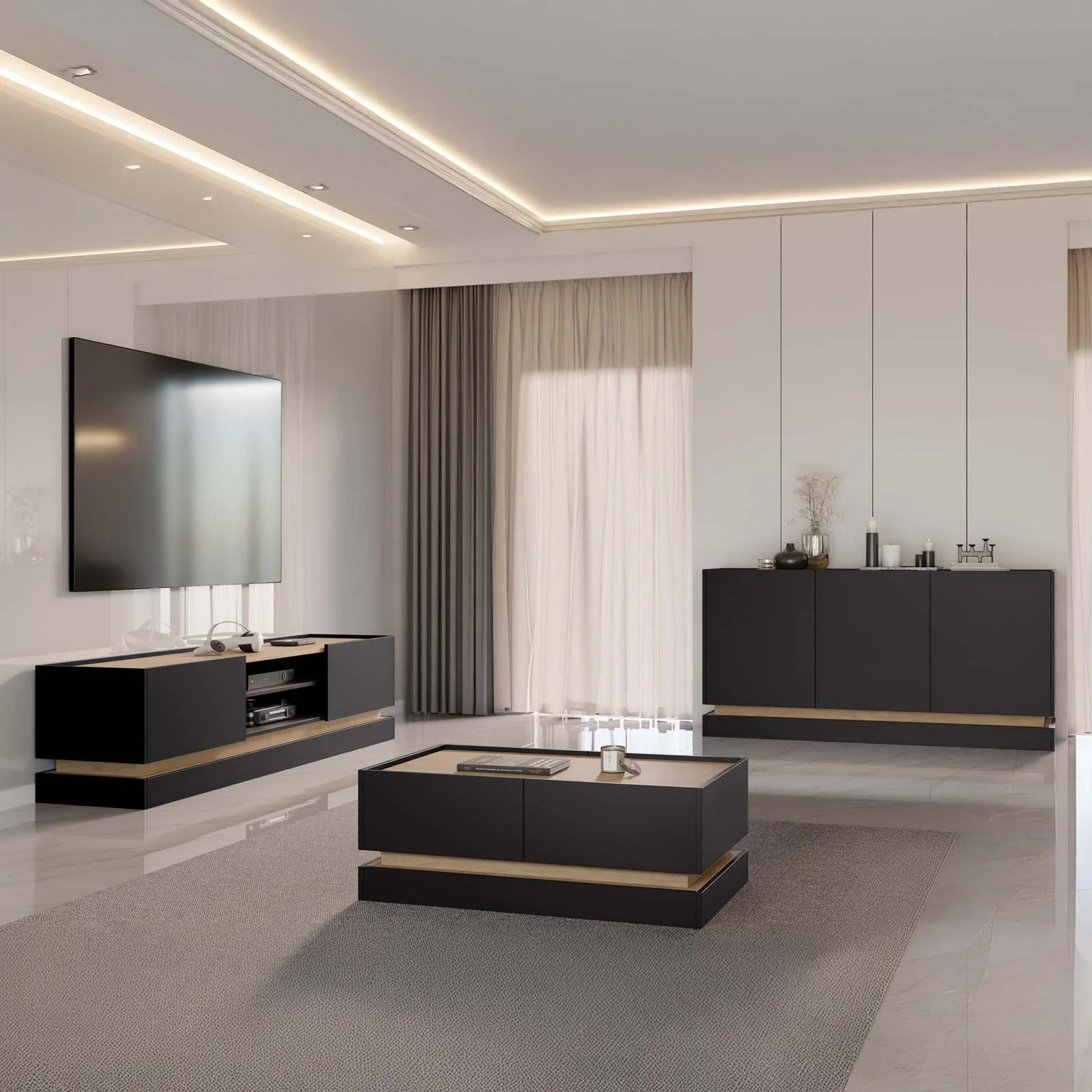 La finitura nera, esaltata dal dettaglio in rovere, crea un contrasto elegante e deciso, perfetto per soggiorni moderni, ambienti industrial o spazi arredati con tonalità scure e ricercate.