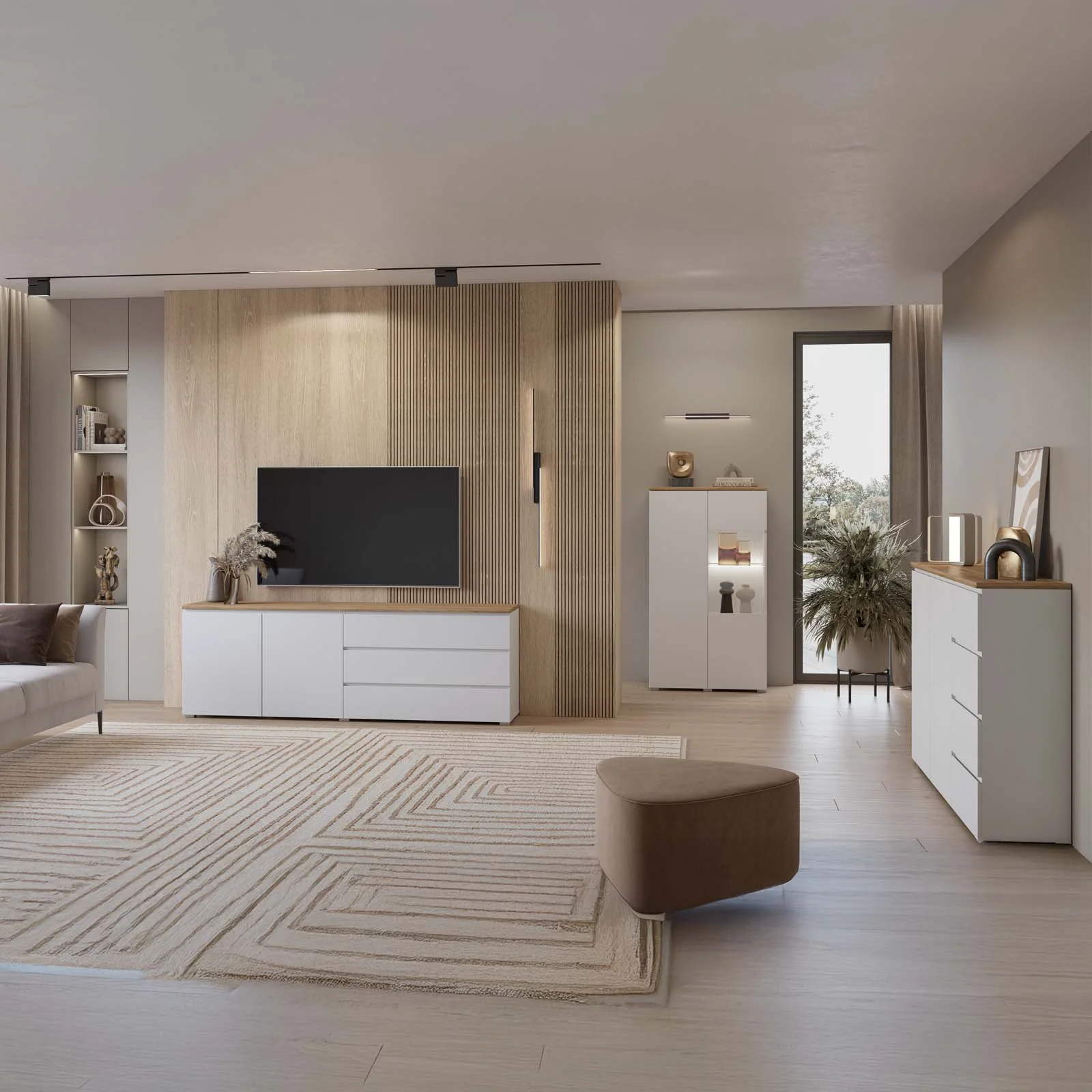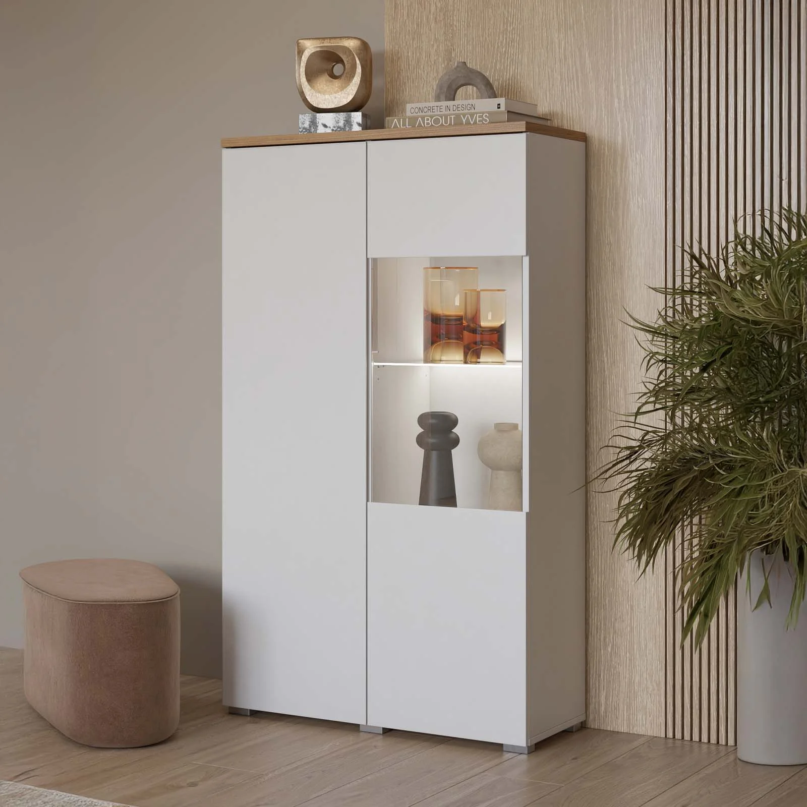 Linee pulite, design moderno e funzionalità: la vetrina della nuova collezione Ischia è il complemento perfetto per arricchire la zona living con stile ed eleganza. La combinazione del bianco opaco con il top in rovere crea un piacevole contrasto naturale, ideale per ambienti contemporanei ma anche per spazi dal gusto più classico.