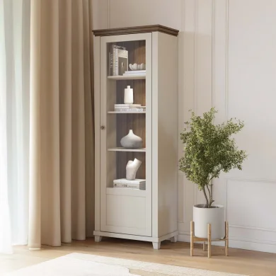 La vetrinetta Texel da 71x200h cm è la soluzione perfetta per chi desidera un arredo compatto ma elegante. La finitura beige con top a contrasto e l’anta in vetro temperato mettono in risalto uno stile raffinato e senza tempo.