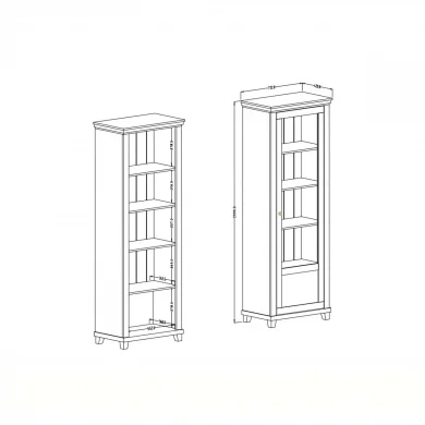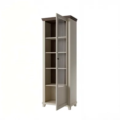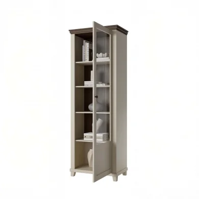 Dotata di 1 anta battente con apertura a sinistra e maniglia in metallo con finitura ottone, racchiude 5 vani organizzati su 4 ripiani, di cui 4 parzialmente a vista: ideali per esporre servizi di bicchieri, libri o oggetti decorativi, mantenendo tutto in ordine e ben visibile.